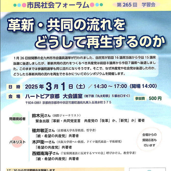 1月26日投開票の北九州市市会議員選挙が行われました。自民党が前回16議席当選から今回15議席当選に後退しましたが、革新共同の流れをつくるべき共産党は前回8議席から今回7議席へ後退しました。このままでは参議院選挙も同じに流れになりそうです。そこで、なぜ共産党や社会党は後退したのか、どうしたら革新共同の流れを再生できるかについてのシンポジウムを開催します。